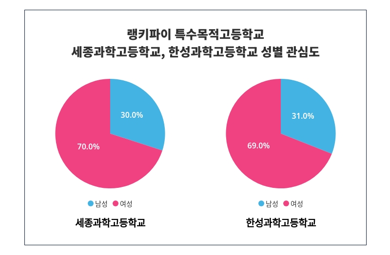 성별 관심도 조사 결과, 세종과학고등학교는 '여성'에서 '70%'로 남성보다 높은 관심을 받는 것으로 나타났다.