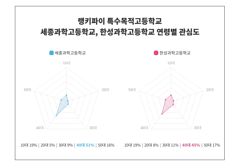세종과학고등학교와 한성과학고등학교에 대한 연령별 관심도가 랭키파이의 최근 조사에서 드러났다. 조사 결과에 따르면, 세종과학고등학교는 특히 40대에서 51%의 매우 높은 관심도를 기록했으며, 세종과학고등학교는 10대 19%, 20대 5%, 30대 9%, 40대 51%, 50대 16% 순으로 각 연령층의 관심을 받았다.